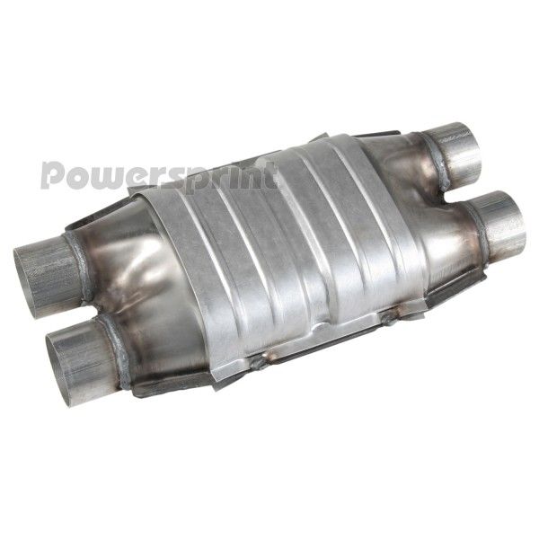 Universaler Motorsport-Katalysator mit 200 cpsi Metall Monolith und angeschweißtem Hitze-Abschirmblech in doppelflutiger Ausführung (Maß Höhe inkl. Hitze-Abschirmblech). Für Benzinmotoren bis 4.0 Ltr. geeignet.
